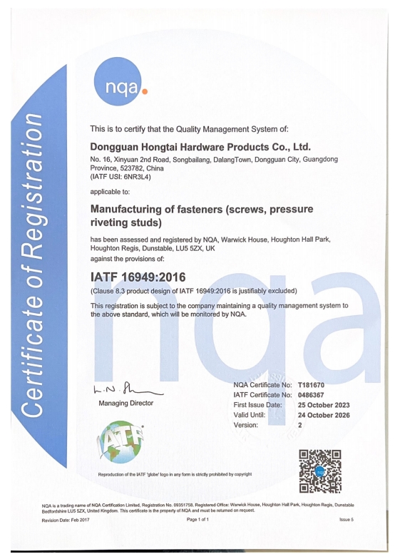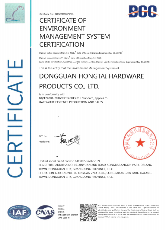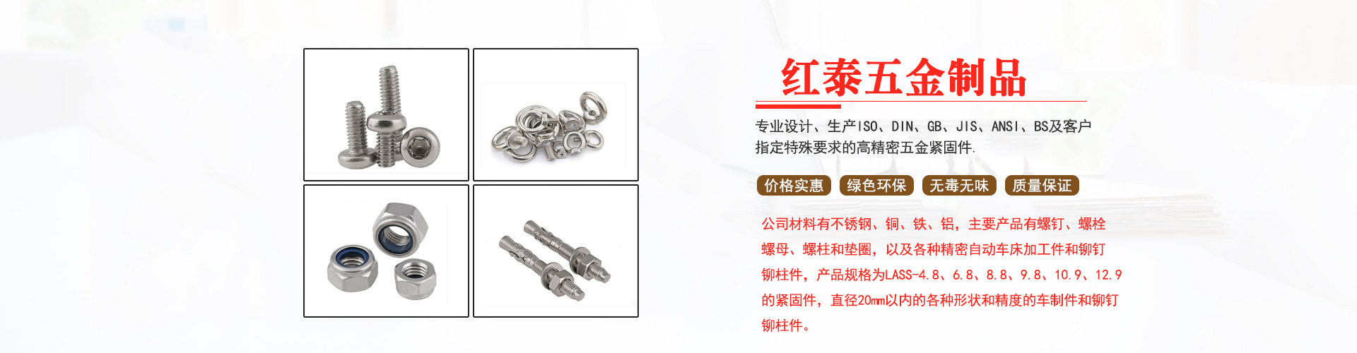 東莞市紅泰五金制品有限公司,公司占地六千多平方米,擁有五十多組螺絲機(jī)及六十臺(tái)自動(dòng)車(chē)床設(shè)備。是一家專(zhuān)業(yè)設(shè)計(jì)、生產(chǎn)ISO、DIN、GB、JIS、ANSI、BS及客戶(hù)指定特殊要求的高精密五金緊固件的制造企業(yè)。